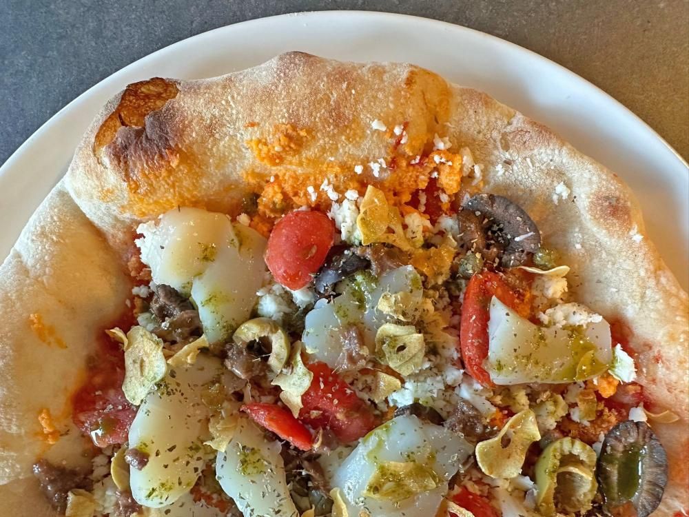 トマトソース、ラテチーズ、オリーブミックス、チェリートマト、ホタテ貝柱、アンチョビ、オレガノ、ガーリックチップ、バジルオイル